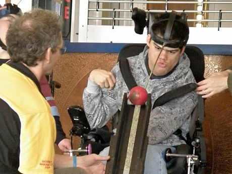 Instead, from his wheelchair, he pushes the ball down a ramp with a pointer extending from his helmet – aiming to hit a white ball several feet away. The aim of the game is to get your ball as close as possible to the white one.